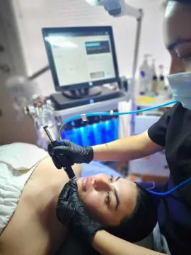 HydraFacial is a three-step treatment that begins with deep cleansing and exfoliation of the skin, followed by the extraction of impurities and dead skin cells from the pores, and lastly, by injecting moisturizing and nourishing serums like glycolic acid to hydrate the skin.